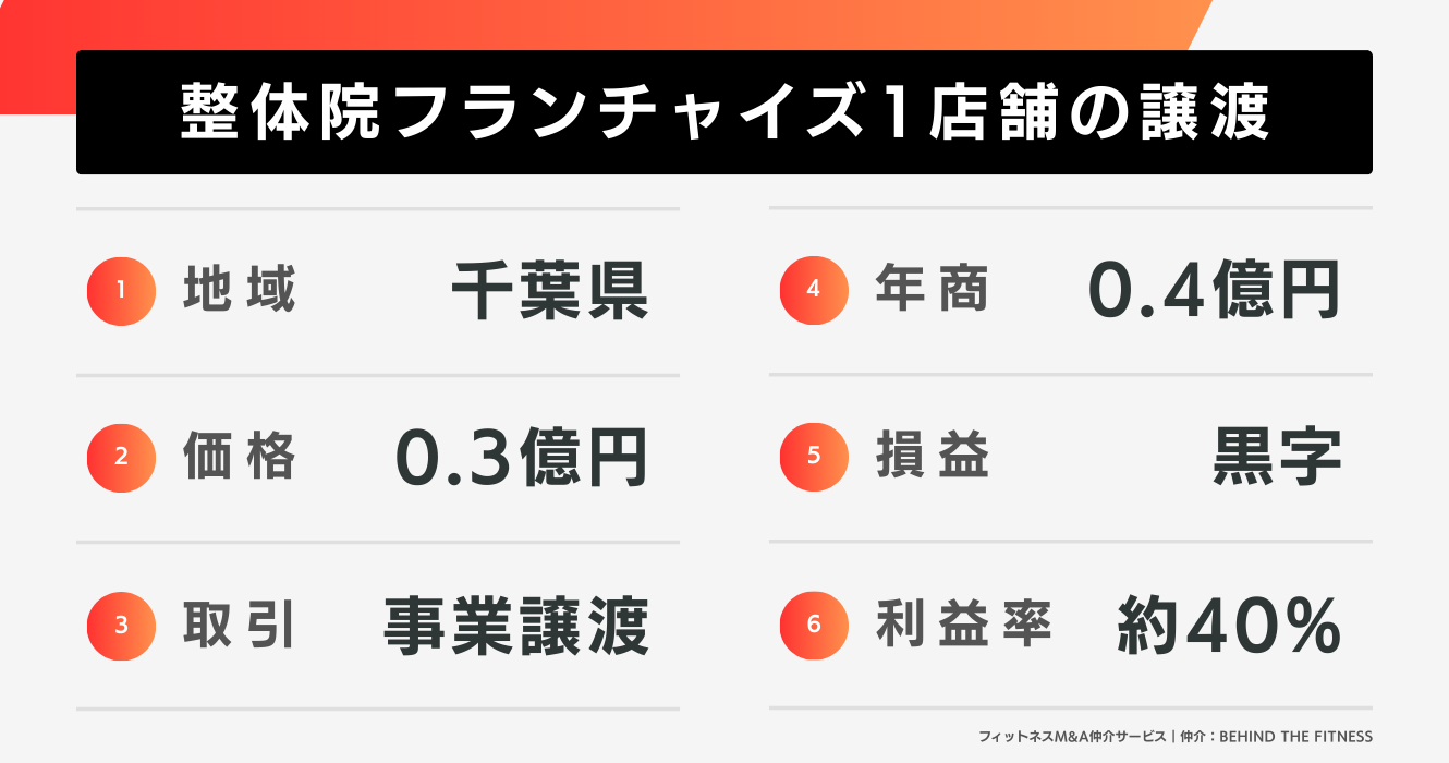 当案件は千葉市内にある整体院1店舗の譲渡になります。当院は、整体フランチャイズに加盟しているフランチャイズ店舗となります。フランチャイズ本部も店舗の譲渡承認済みです。