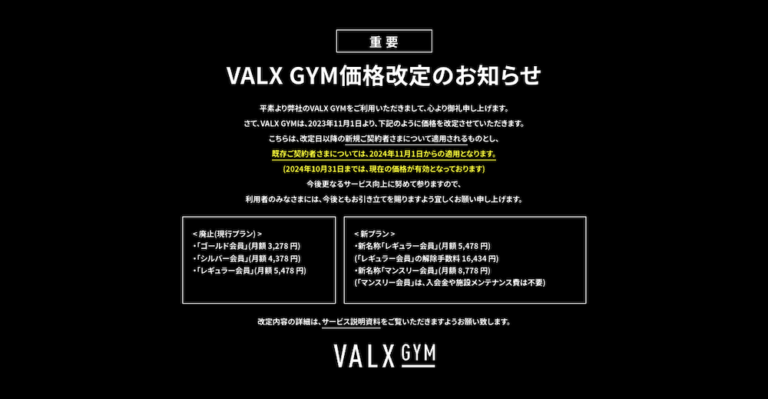 24時間フィットネスジム「VALX GYM」は、公式サイト及びX(旧Twitter)にて、価格改定のお知らせとして値上げを発表した。これまで運用されてきた3プラン、ゴールド会員:月額2,980円(税込3,278円)、シルバー会員:月額3,980円(税込4,378円)、レギュラー会 … 続きを読む 【追記あり】低価格24ジム「VALX GYM」が値上げ、月会費2,980円プランは廃止