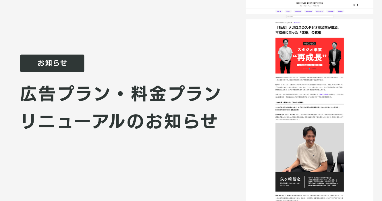 いつもオンラインのフィットネス業界誌「BEHIND THE FITNESS(以下、BTF)」をご覧いただきありがとうございます。BTFはこの度、創刊から4周年を迎え、媒体資料・広告プランをリニューアルいたしました。