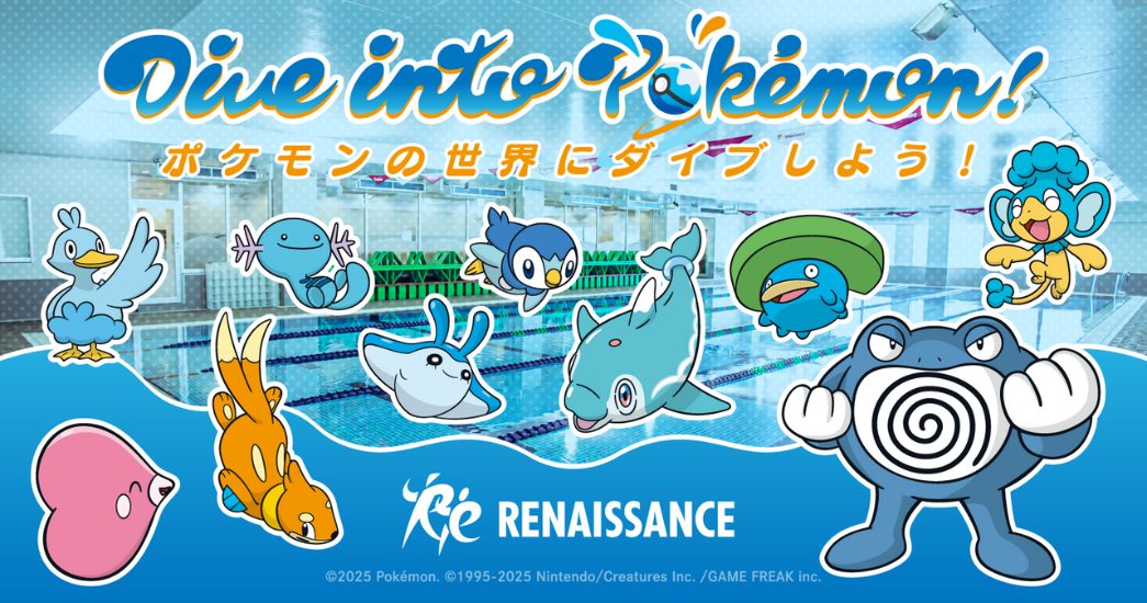 「Dive into Pokémon!~ポケモンの世界にダイブしよう!~」は、ルネサンスでスイミングを習う子供たちに向け、みずタイプのポケモンたちの店舗装飾を展開する。実施期間は2025年7月9日から2027年2月28日まで、装飾は店舗ごとに順次実施される。
