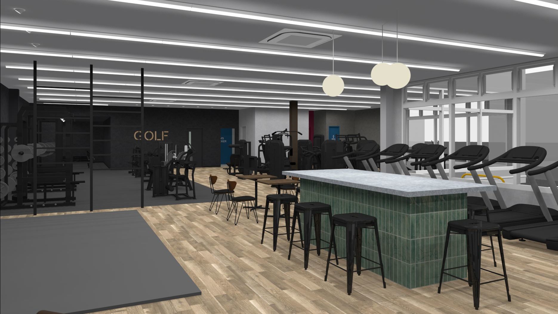 ジムエリアには、パワーラック2台、ハーフラック1台、スミスマシン1台、アジャスタブルベンチ7台、カールベンチ1台、ダンベル1〜40kg(各2本)を設置。マシンゾーンには、レッグプレス、アウターサイ、チェストプレス、ショルダープレス、ラットプルダウン、ディップ補助に加え、プレートロード式マシンも複数導入している。有酸素マシンは、トレッドミル5台、アップライトバイク2台、エリプティカル2台を備える。