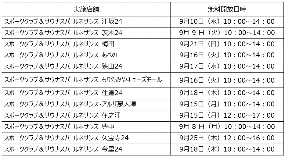 大阪府は厚生労働省が定める「健康増進普及月間」に合わせて、9月に「健活10」の項目である「ヘルスリテラシー」および「身体活動・運動」の啓発に重点的に取り組む。この方針に沿い、ルネサンスが運営する大阪府内全12店舗のスポーツクラブにおいて、府民向けの無料開放DAYが実施する。各店舗ともに定員は30名で、利用には予約が必要となっている。