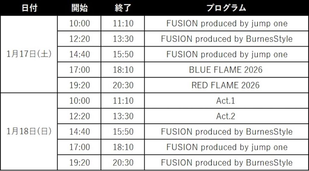 当日のタイムスケジュールは、「BurnesStyle」および「jump one」それぞれの単独プログラムに加え、コラボプログラム「FUSION」が展開される。BurnesStyleは「BLUE FLAME 2026」「RED FLAME 2026」を、jump oneは「Act.1」「Act.2」を提供し、さらに「FUSION produced by BurnesStyle」「FUSION produced by jump one」という2ブランド合同のプログラムも実施される。