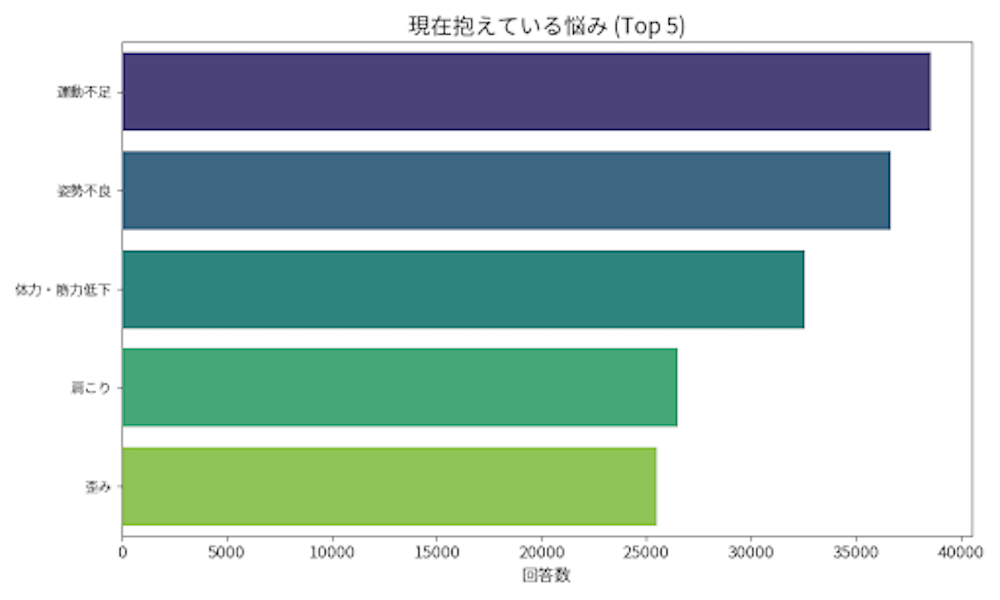 「現在抱えている悩み」では、「運動不足」が最も多く38,594人、次いで「姿勢について」が36,694人、「体力・筋力低下」が32,563人と続いた。「肩こり」は26,522人が回答し、「腰痛」についても多くの回答があった。スマートフォンの長時間使用やデスクワークの影響が背景にあるとされ、年代を問わず多くの女性が姿勢に悩みを抱えていることが示された。