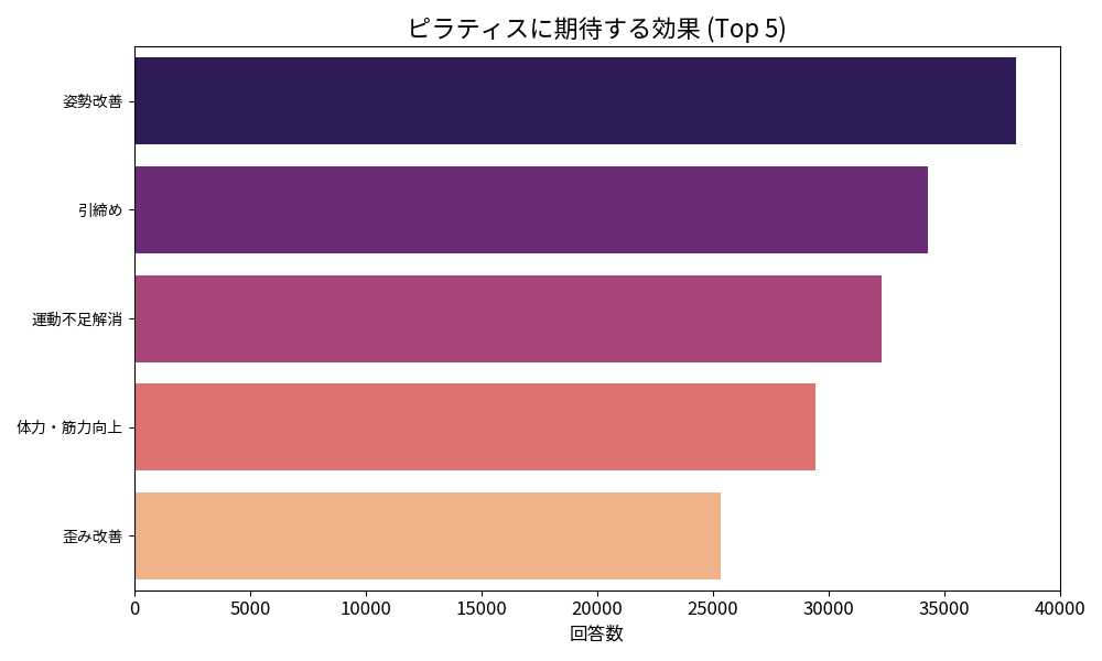 「ピラティスに期待する効果」では、「姿勢」が38,108人で最多となり、「引締め」が34,285人で続いた。「運動不足解消」は上位から外れ、姿勢改善やボディラインへの意識が高いことが明らかとなった。会員は単に体を動かすことではなく、姿勢の変化や身体の使い方の改善を重視している。