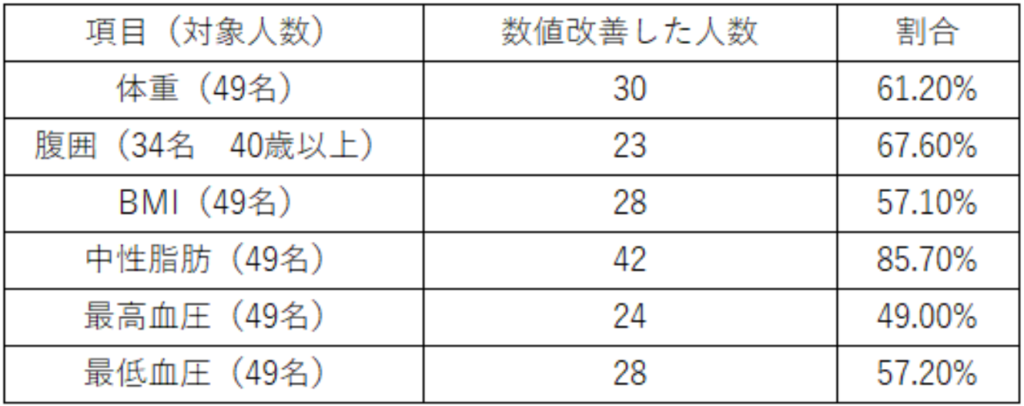 実施期間は2025年3月から6月までの4ヶ月間で、同年10月に健康診断結果データの確認・検証を行った。検証指標は、体重、腹囲、BMI、中性脂肪、血圧の前年度比較とした。