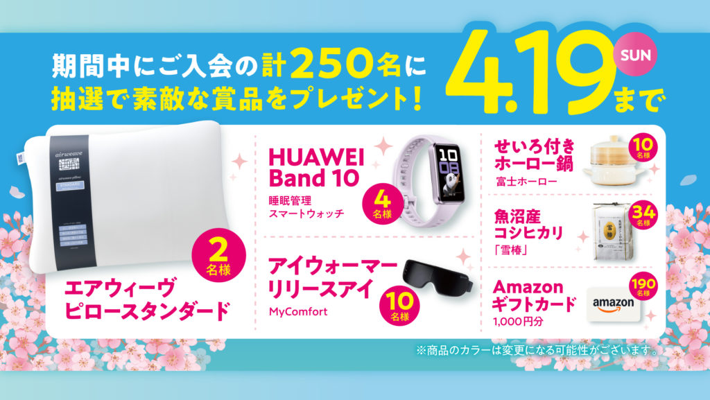 賞品には、エアウィーヴ ピロースタンダード(2名)、HUAWEI Band 10(4名)、アイマッサージャー ミスト温熱(10名)、せいろ付きホーロー鍋(10名)、魚沼産コシヒカリ「雪椿」(34名)、Amazonギフトカード(190名)が含まれる。賞品の発送は2026年5月中旬頃を予定している。なお、賞品受取前に退会や対象プランの解約、返金処理を行った場合は、賞品の進呈は取り消しとなる。