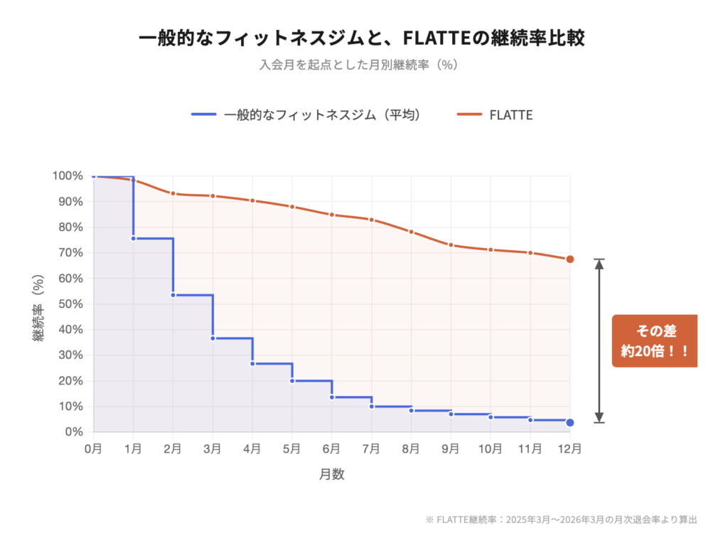 その結果、半年間で入会率は8割を超え、売上および会員数は約2倍に成長し、現在も安定した収益を生む事業として継続的に運営されている。また、FLATTEの継続率は一般的なフィットネスジムを上回り、業界平均では入会から6ヶ月後の継続率が約13%とされる中、同ブランドでは約90%の会員が半年後も継続し、12ヶ月後においての継続率は業界平均(3.7%)と比較して約20倍の差があるとされている。